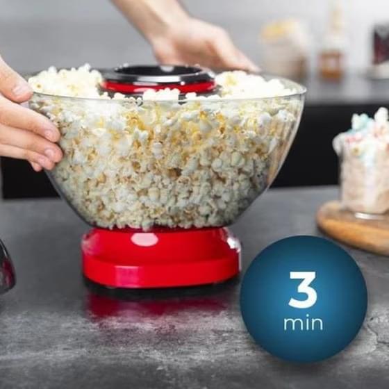 Με πρωτοποριακό σχεδιασμό και ομοιόμορφη ροή θερμού αέρα, φτιάχνει τα πιο τραγανά και γευστικά popcorn σε μόλις 2-4 λεπτά, χωρίς απώλειες και χωρίς καψίματα.